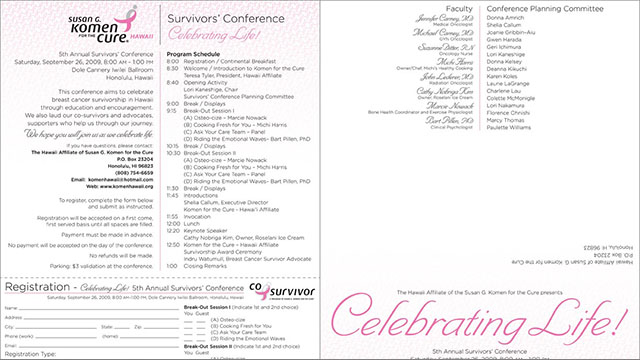 Full color, two-sided 8.5"x11" flyer for the Susan G. Komen for the Cure Hawaii Survivors' Conference
